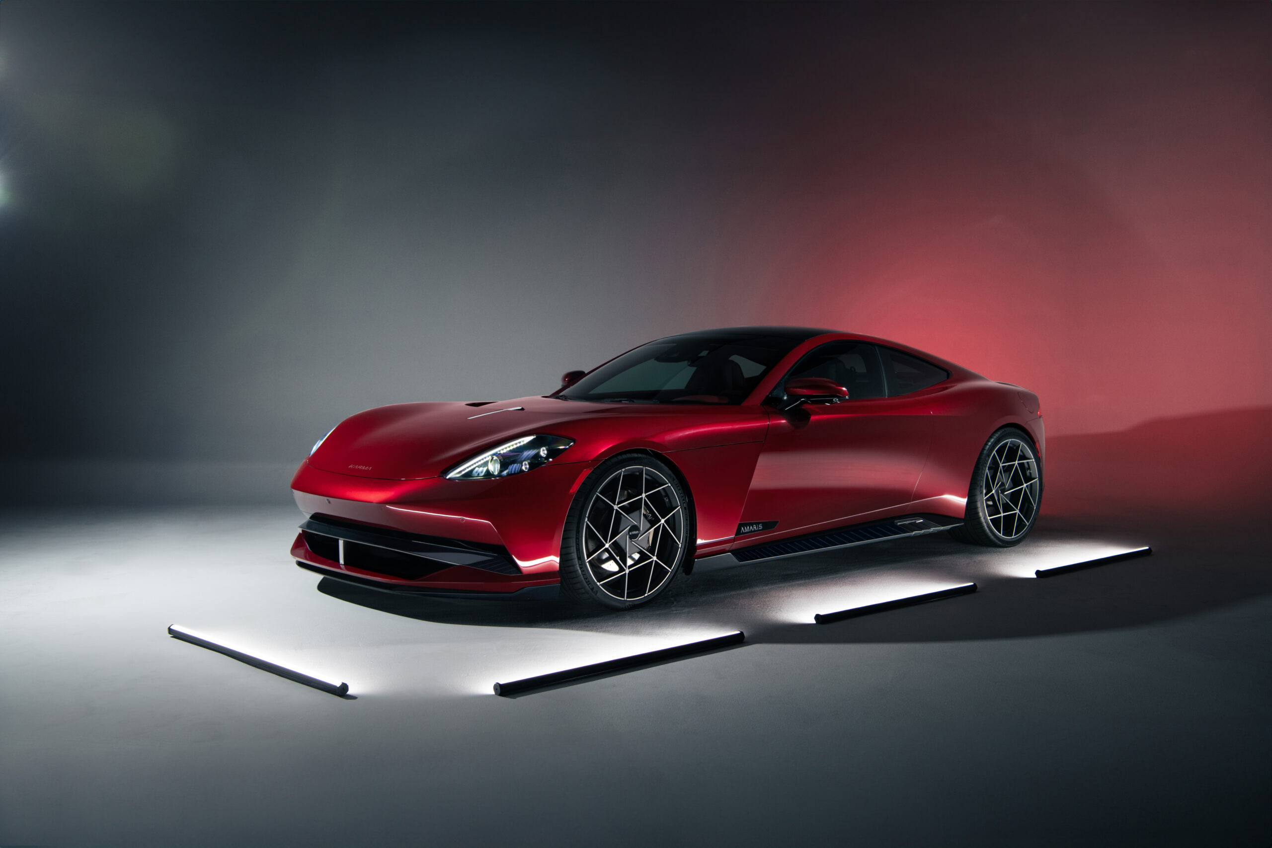 The powerful yet timelessly elegant carbon fiber and aluminum body of the Amaris, specified for Monterey Car Week in Solar Blaze Red paintwork, features the latest evolution of the Comet Line design language first established with the upcoming Karma Kaveya super-coupe. With Amaris, the Comet Line originates in the sculpted cowl aft of the nose, continuing rearward in an arc across the sides of the hood, descending rearward to amplify the wide, aggressive rear track. 22” Constellation wheels, crafted in forged aluminum, fully-establish the purposeful, fluid stance of the Amaris. The voluptuous clamshell hood – incorporating Karma’s Target Lighting signature – creates a seamless transition and visual flow to the front fenders. The Backslash design element punctuates the space between the front wheels and the “swan doors,” which gracefully pivot upwards to dramatic effect. Its sleek rear glass profile concludes with an aero pass-through spoiler that reduces aerodynamic drag while creating rear axle downforce for increased stability at high speeds. The Americana-inspired side exhaust further signals performance and capability.